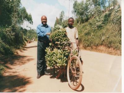 Le PDG avec un transporteur-vélo des régimes des bananes sur la route BENI-BUTEMBO à Maboya...